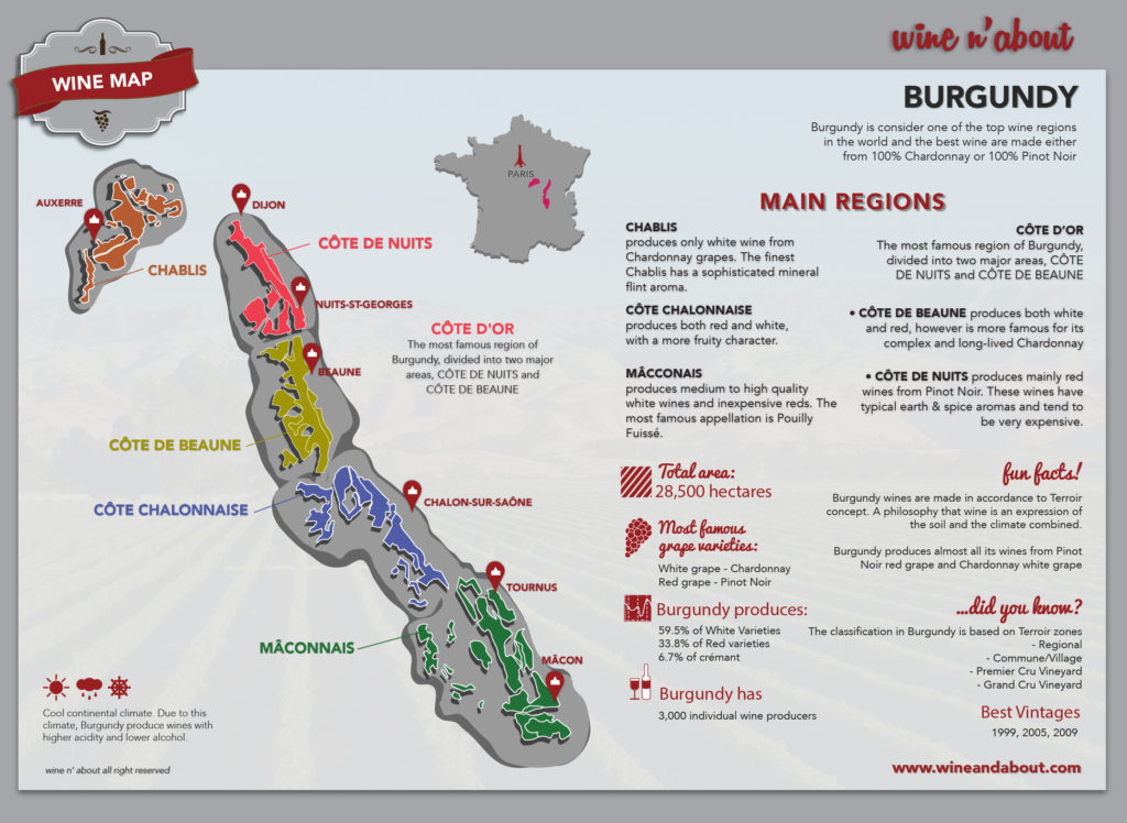 Chablis is part of Burgundy but sits northwest of the other regions, close to the Champagne region, and will not be discussed in this article.